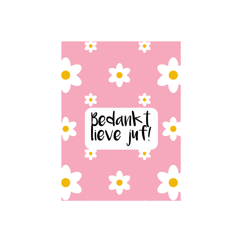 Vrolijke ansichtkaart met de tekst Bedankt lieve juf! Leuke kaart om te geven aan het einde van het schooljaar aan de juf te geven. Een persoonlijke boodschap op de wenskaart maakt het helemaal af.