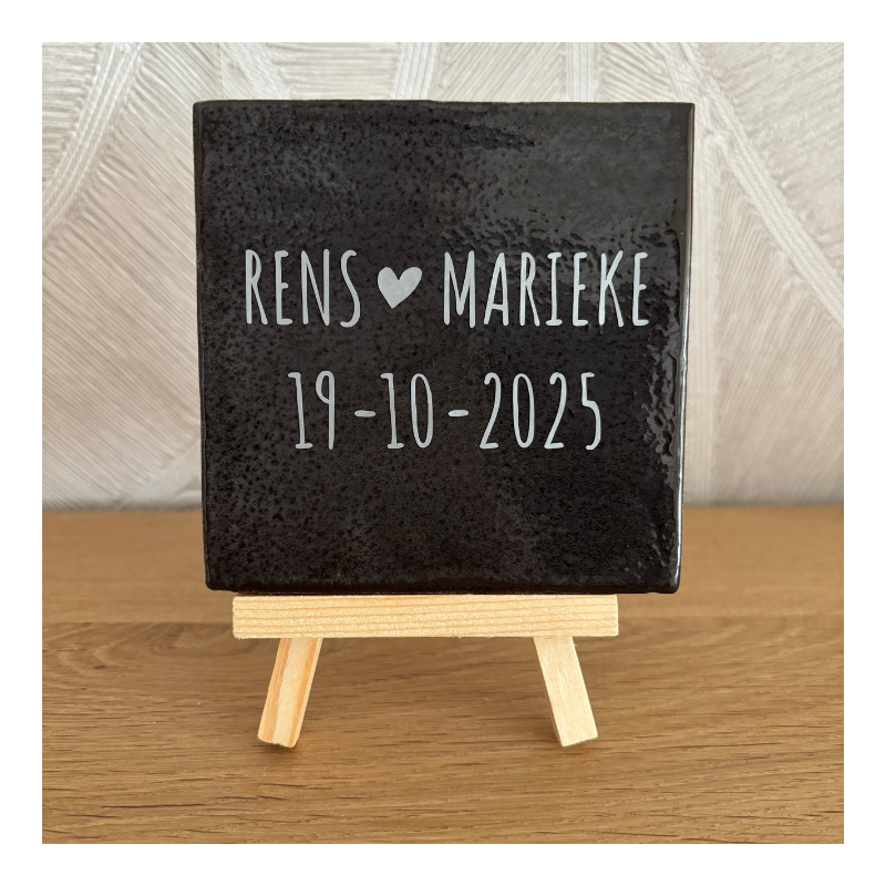 Tegeltjes: de trend van nu. Je ziet ze overal, natuurlijk ook bij van Kootje. Onder ander dit tegeltje met de namen van het bruidspaar en de trouwdatum. Een heel leuk cadeautje om te geven als cadeau op een bruiloft.